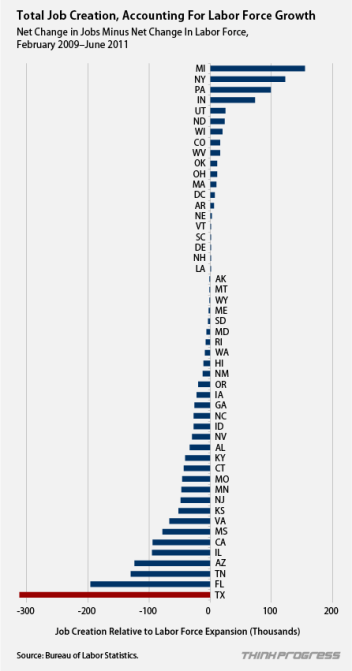 Gov. Rick Perry (R-TX), since he launched his presidential campaign on Saturday, has paraded around the stat that “since June of 2009, Texas is responsible for more than 40 percent of all of the new jobs created in America.” “Now think about that. We’re home to less than 10 percent of the population in America, but 40 percent of all the new jobs were created in that state,” Perry says.