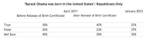 According to YouGov’s Adam Berinsky, the proportion of Americans who said that Obama was born in the United States rose from 55 percent before April 2011 to 67 percent afterward. Likewise, for Republicans—the group most likely to believe the conspiracy—the number who said Obama was born a citizen increased from 30 percent to 47 percent. Still low, but a real improvement.
