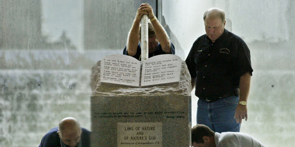 Workers remove a monument of the Ten Commandments from the rotunda of the Alabama Judicial Building after Superior Court Justice Roy Moore refused to take it down in 2003